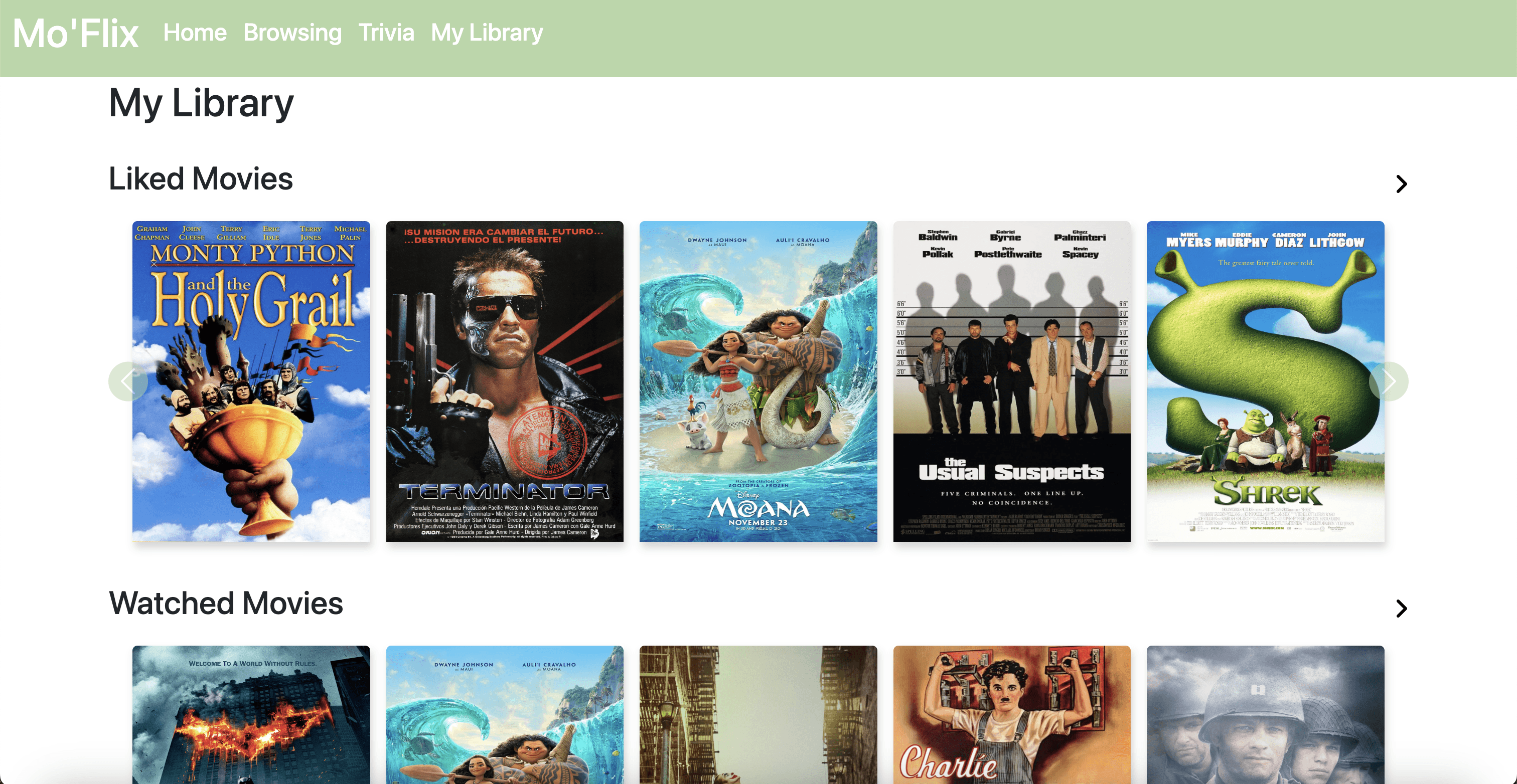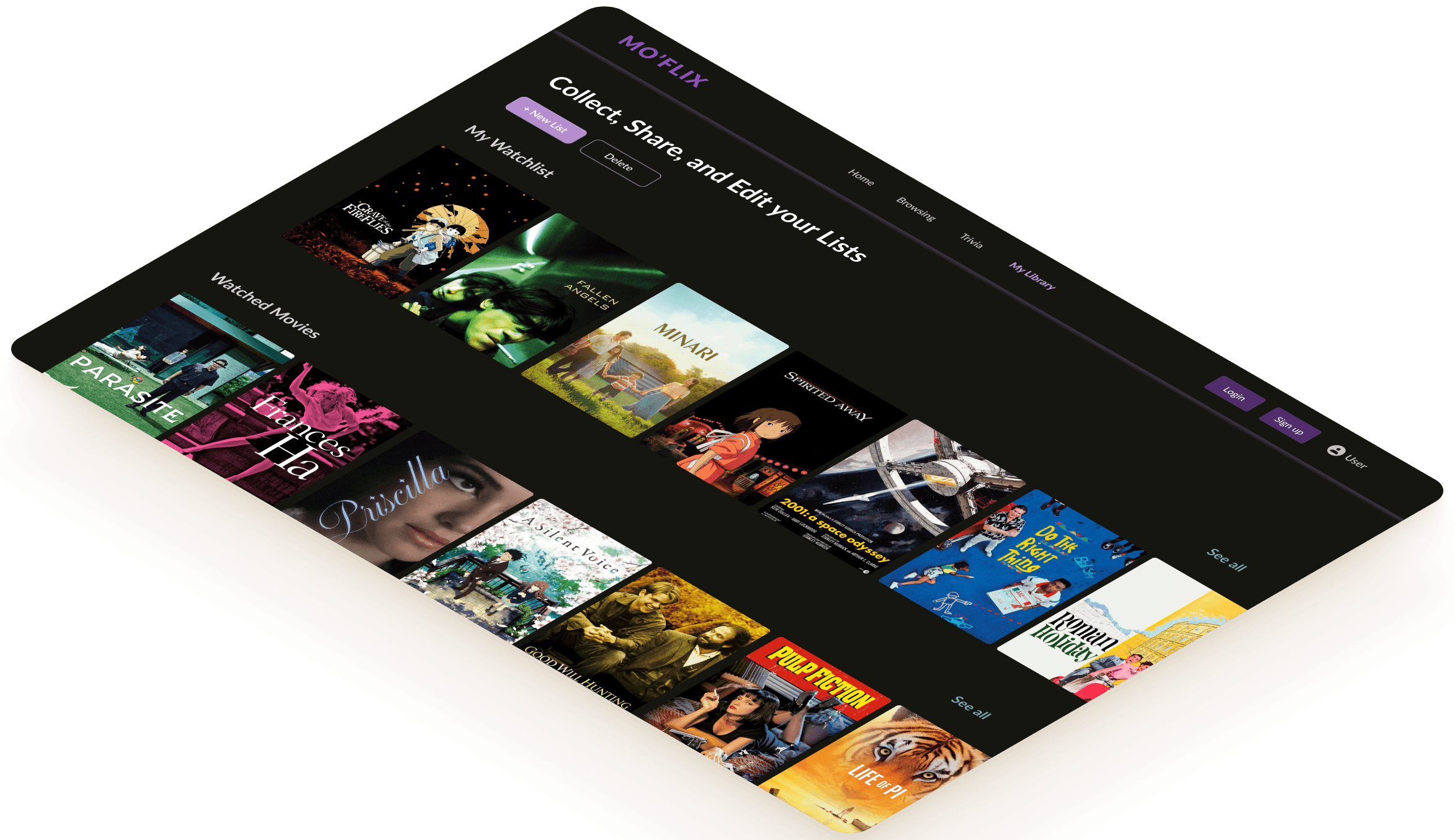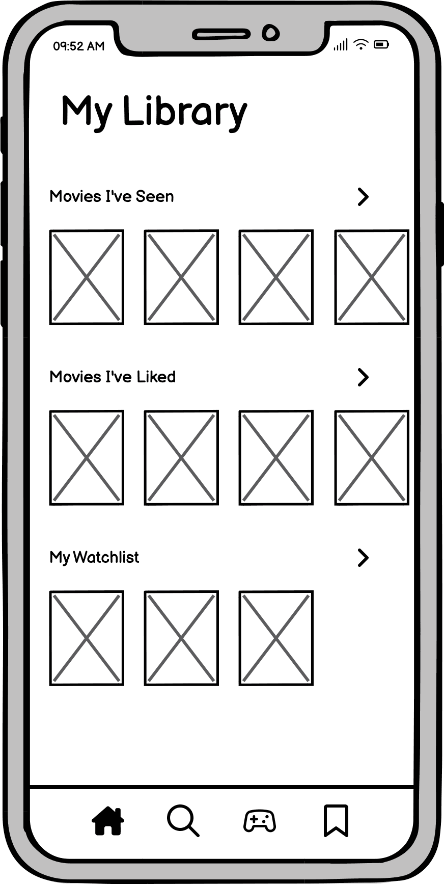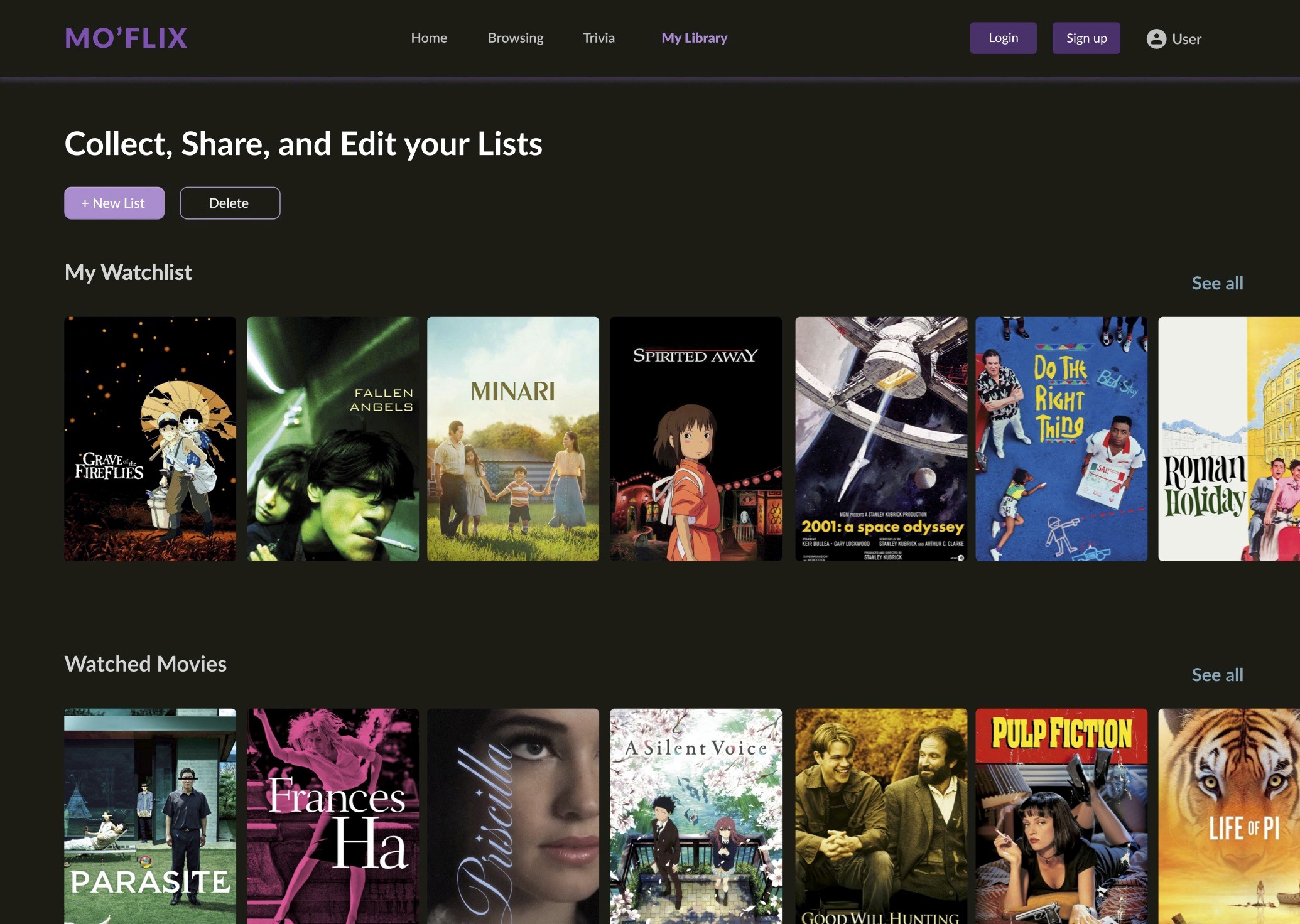 The library page consists of a three-step route starting with the main page titled My Library. The main page includes three lists: watched movies, liked movies, and my watchlist. Users can scroll through each list and view the films they’ve included for each section.