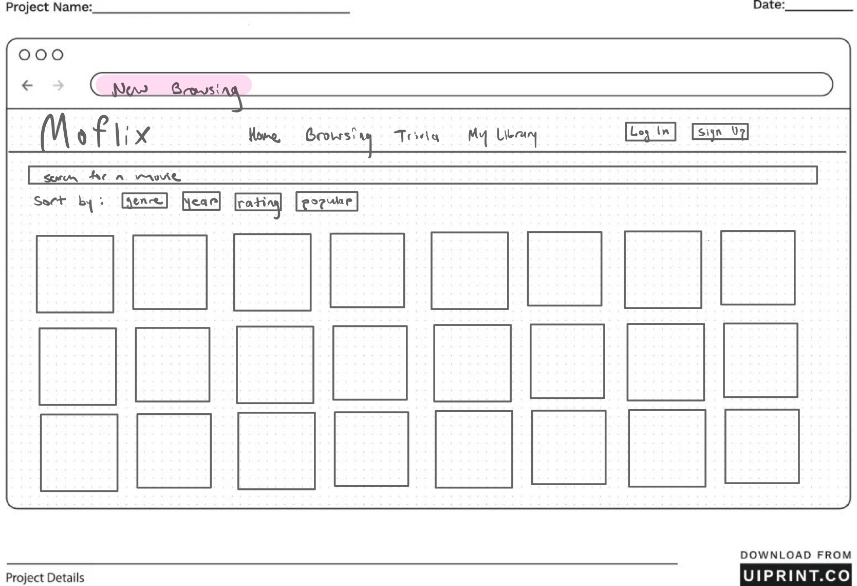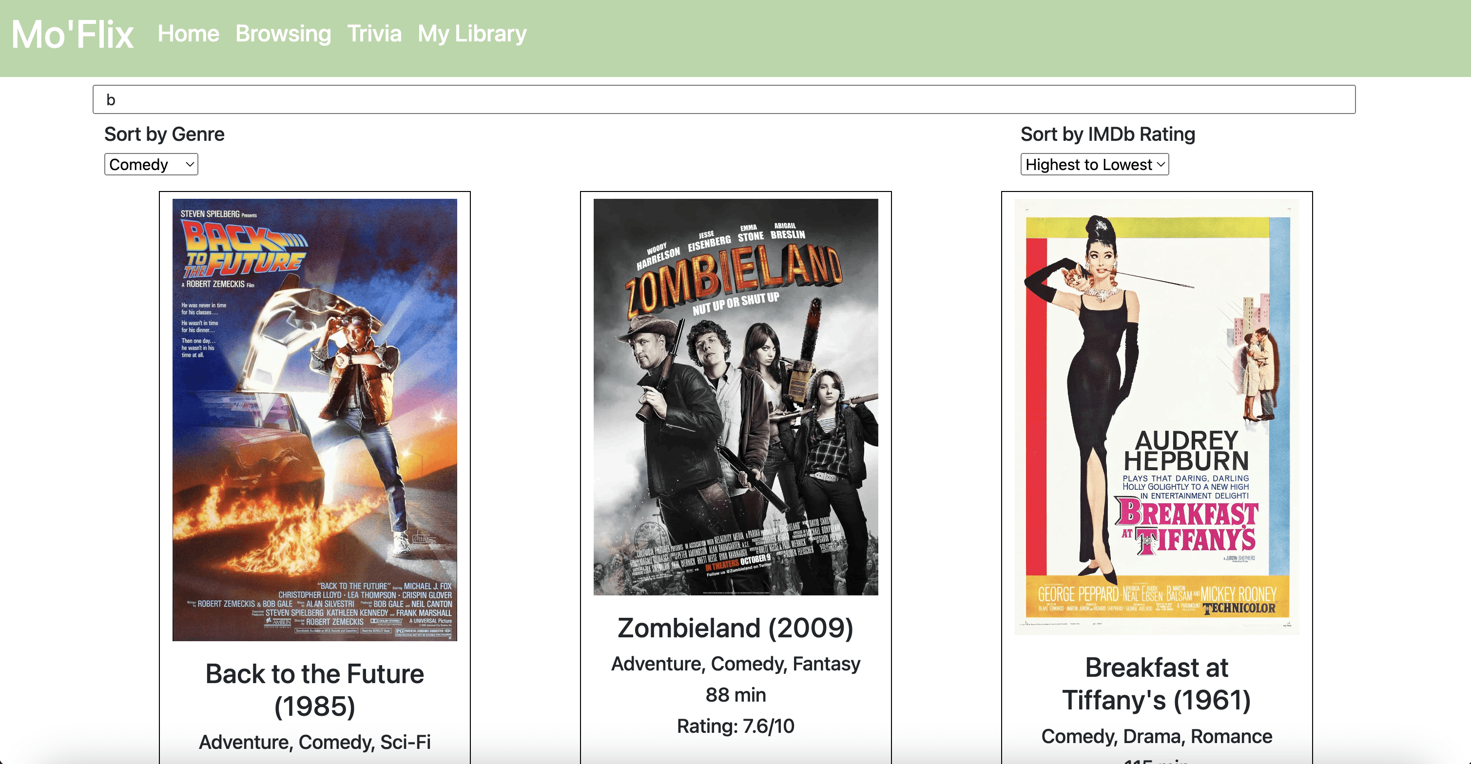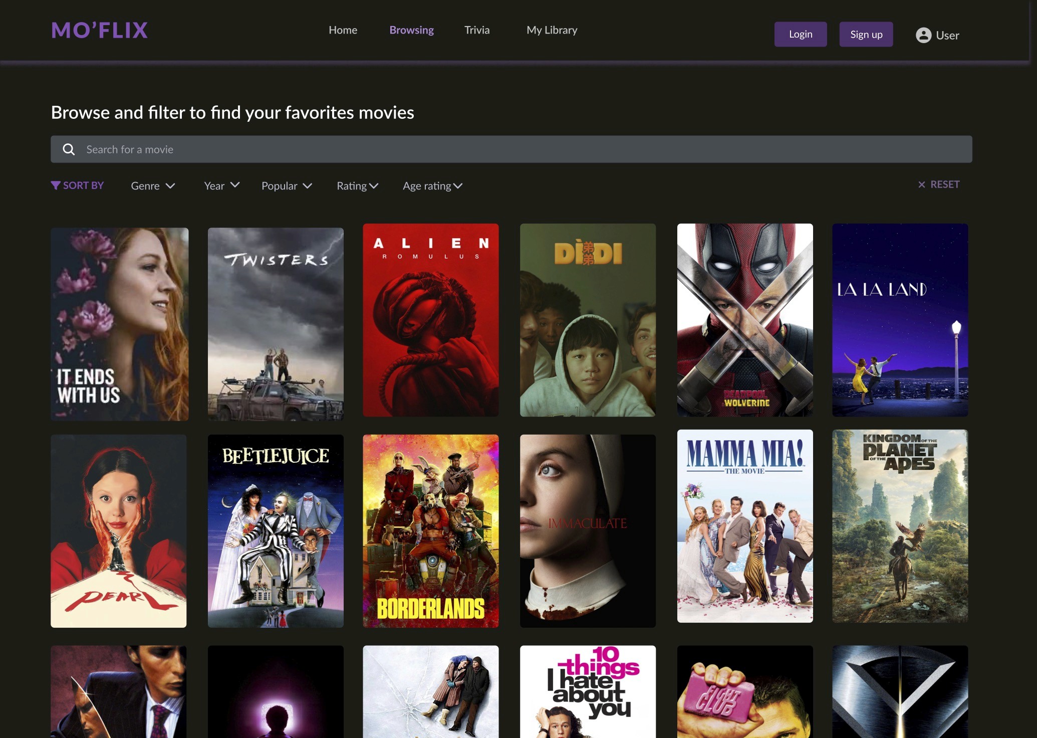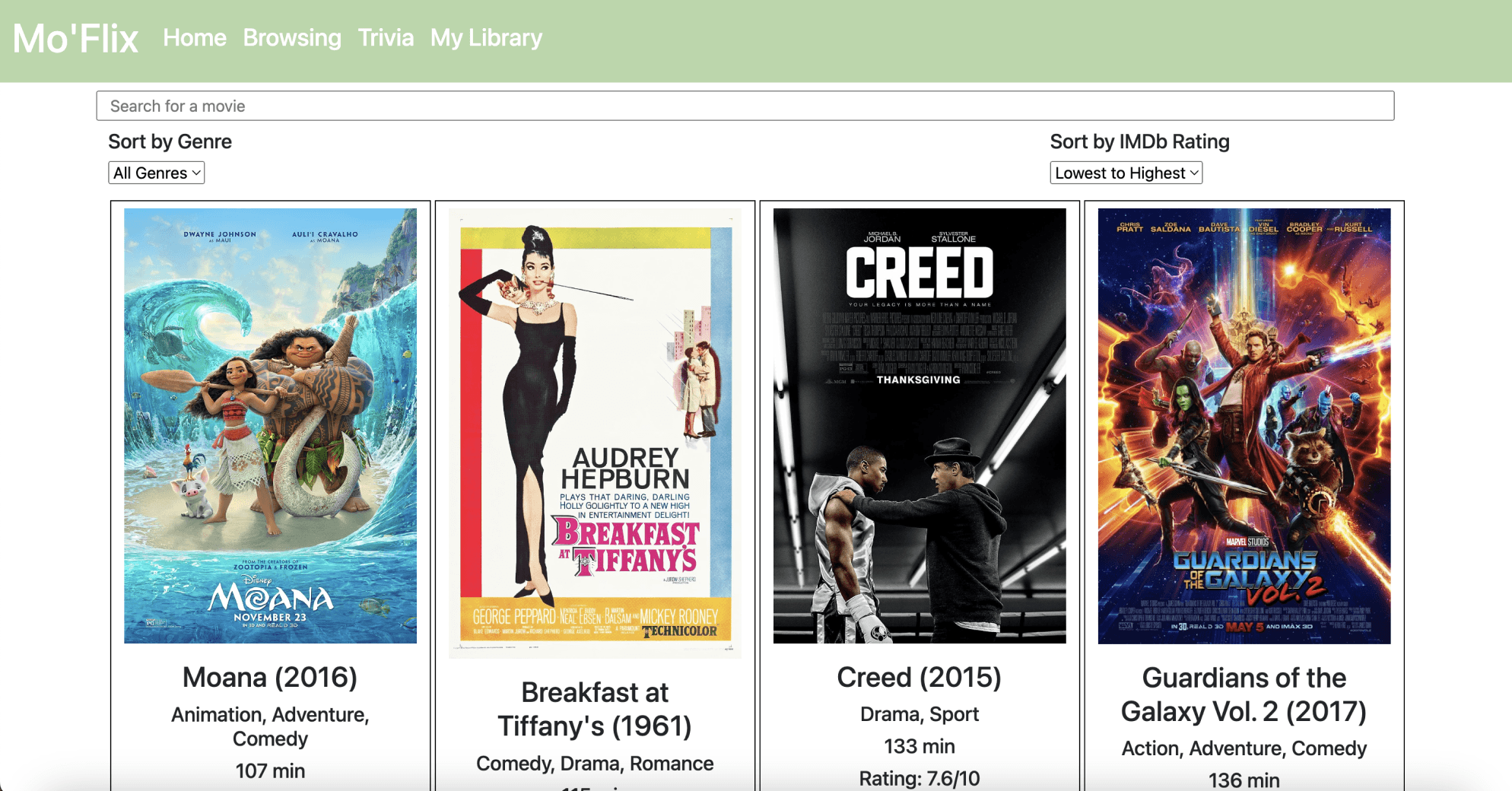 Regarding the browsing page, I aimed to make the filtering section a bit more visually clear. The search bar is larger and easier to see and there are more options to filter the movies such as by year, popularity, and more. Instead of having the posters include the year and genre, now they only include the poster to give it a more cleaner and simplistic look for users.