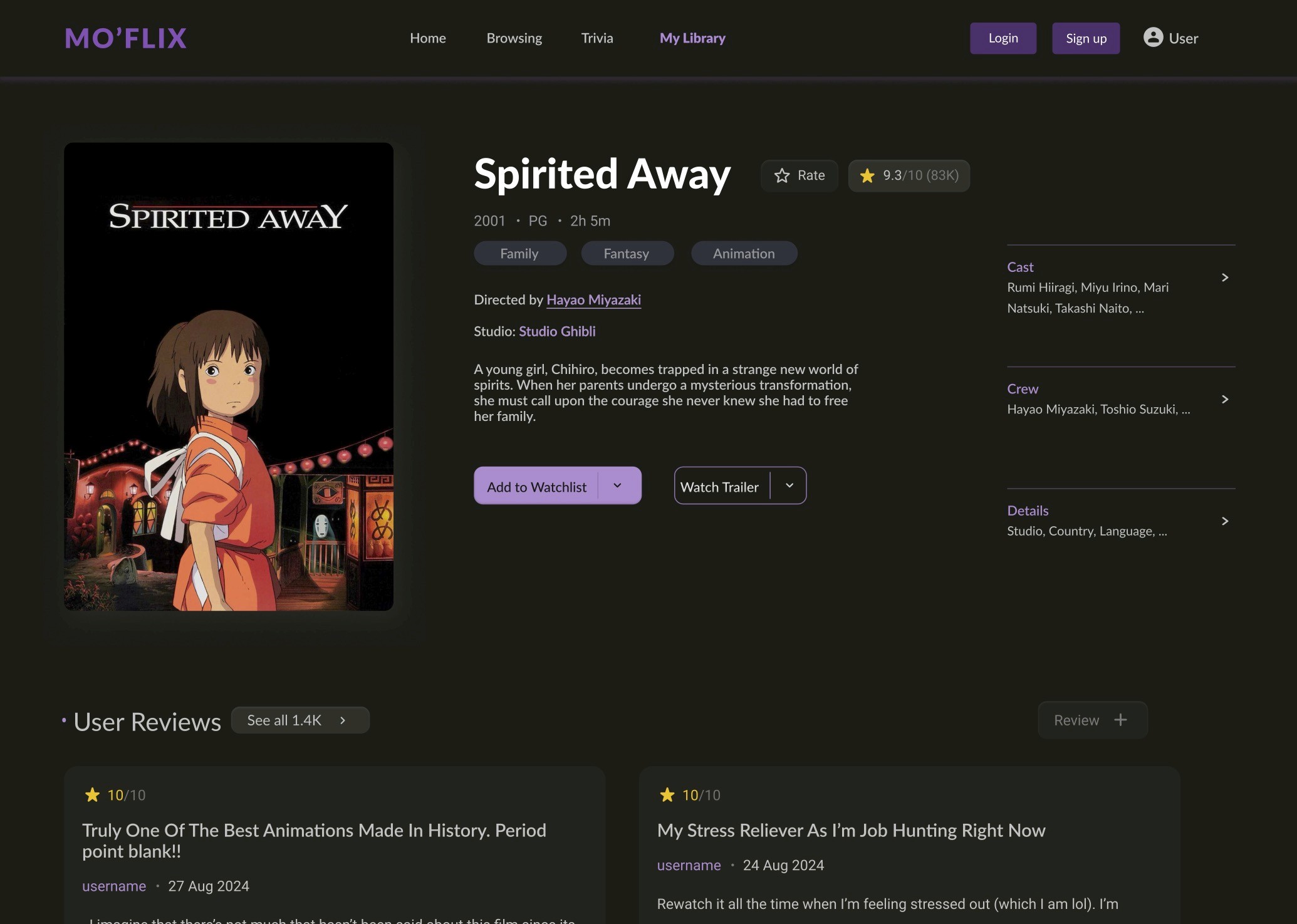 In addition, users can pause the trailer as this can be a preference that varies per person. Some of the elements contained in the overview section are the poster, director, runtime, IMDb rating, genres, description, and ability to add the movie to the library page. Each feature plays a vital role in providing a thorough run-down of the films since learning about movies can be time-consuming.