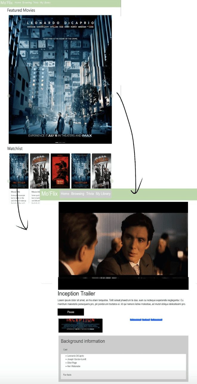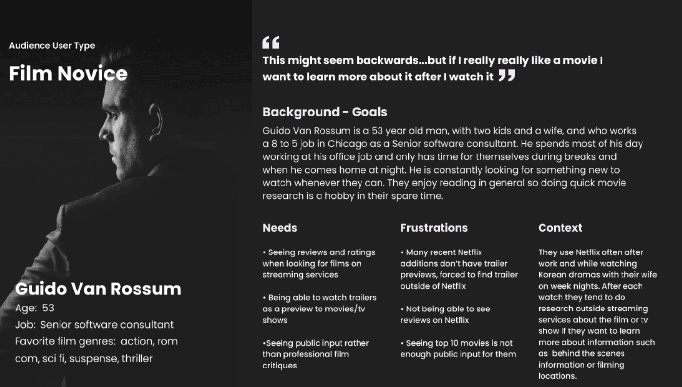 For the movie profile page, our initial ambitious idea of having a caption and pause button over the movie trailer has proved to be a hindrance rather than a benefit. With the way we implemented our prototype, users now have to scroll and search for said pause button. In addition, users felt the format was a visual eyesore. Thus to fix the problems mentioned by our participants, I implemented a lot of changes in the final decision - a complete rework. Majority of the data included is still in the prototype but there’s additional components such as including user reviews and general information to the right side of the screen.