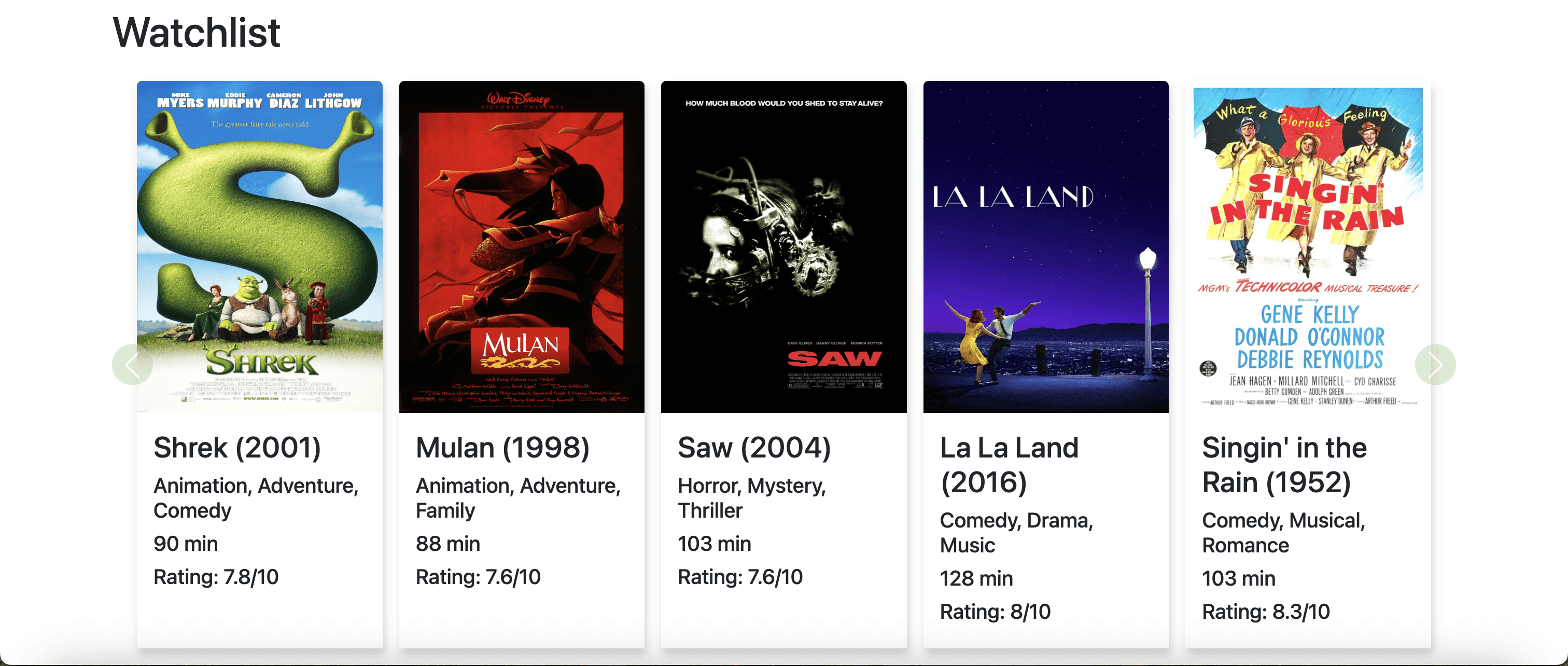 For the library page, we suggest that the watchlist carousel be moved closer to the top of the screen. Rather than being placed below the “Seen” and “Liked” carousels, it could be placed on top of them so it is more visible upon first visiting this page. In addition, allowing users to edit their lists by either adding or deleting a list gives users autonomy over their lists decisions