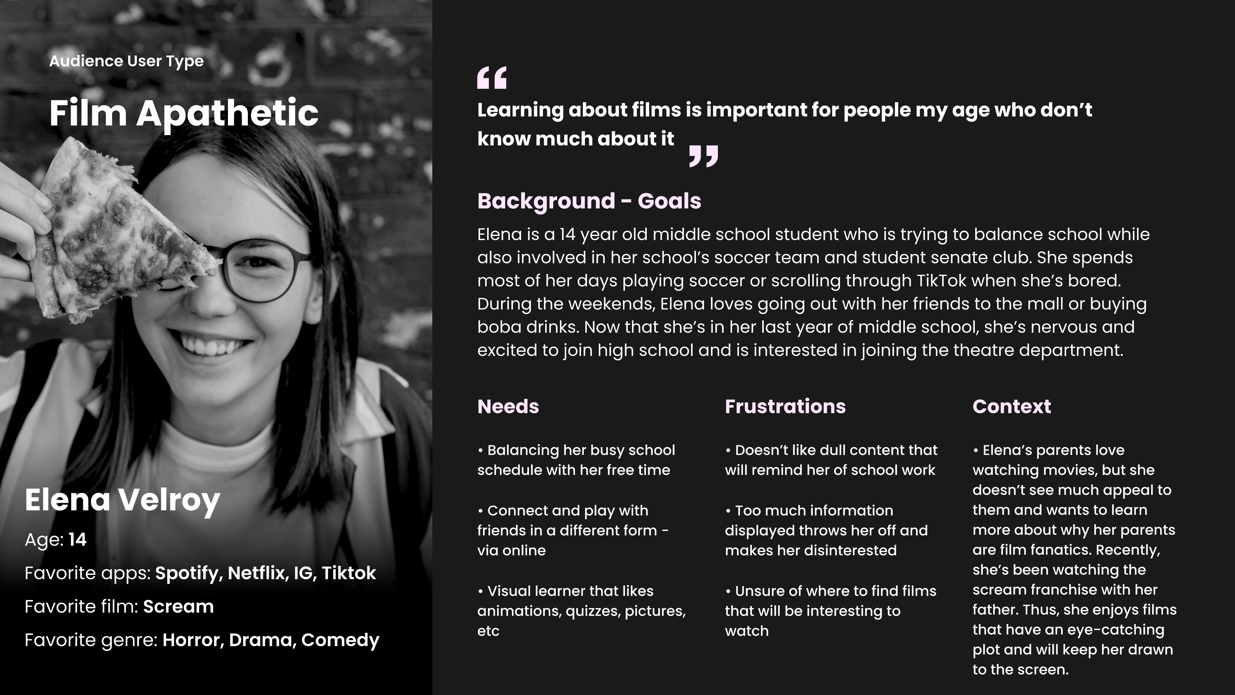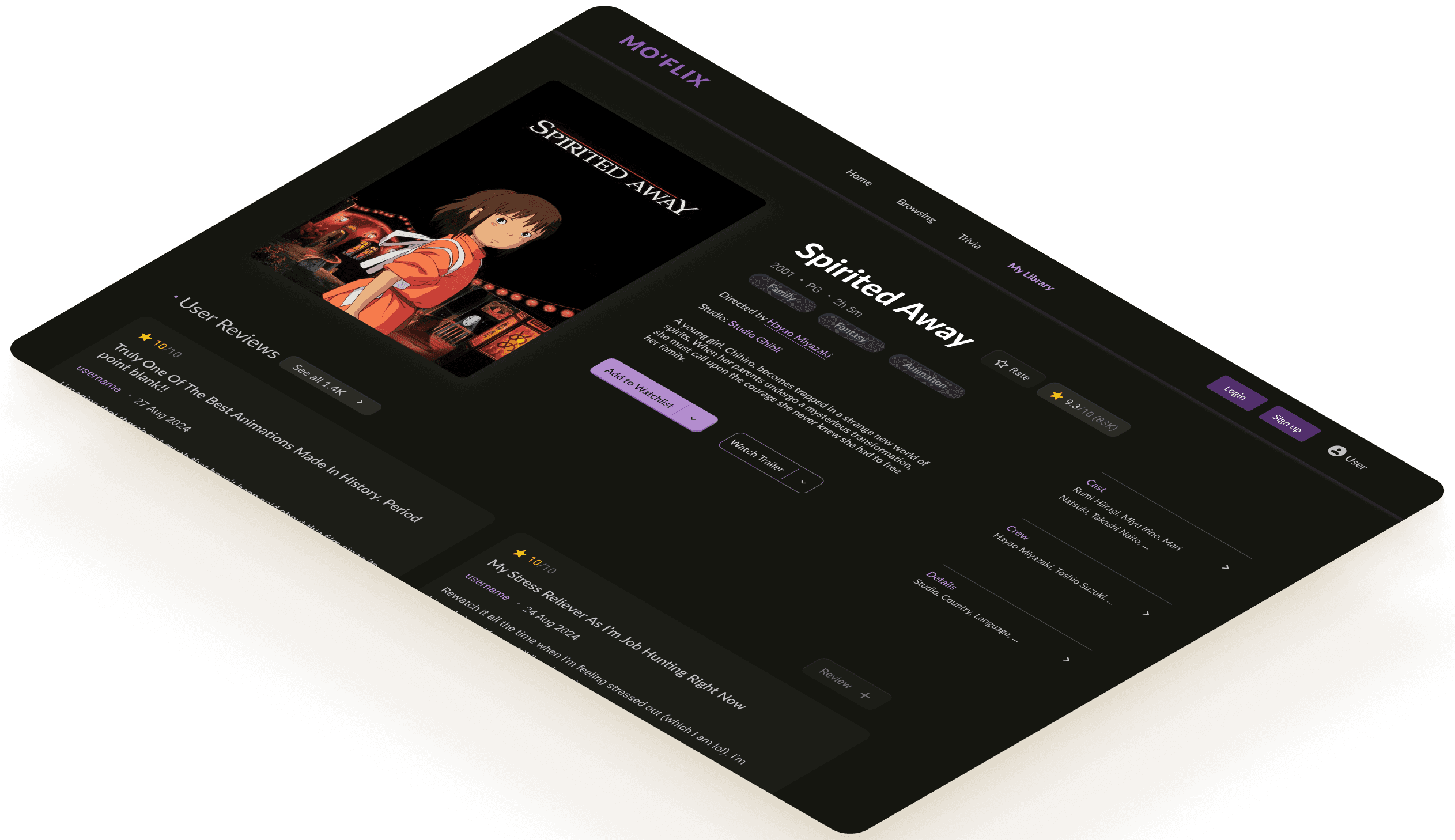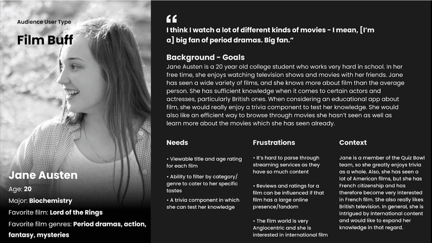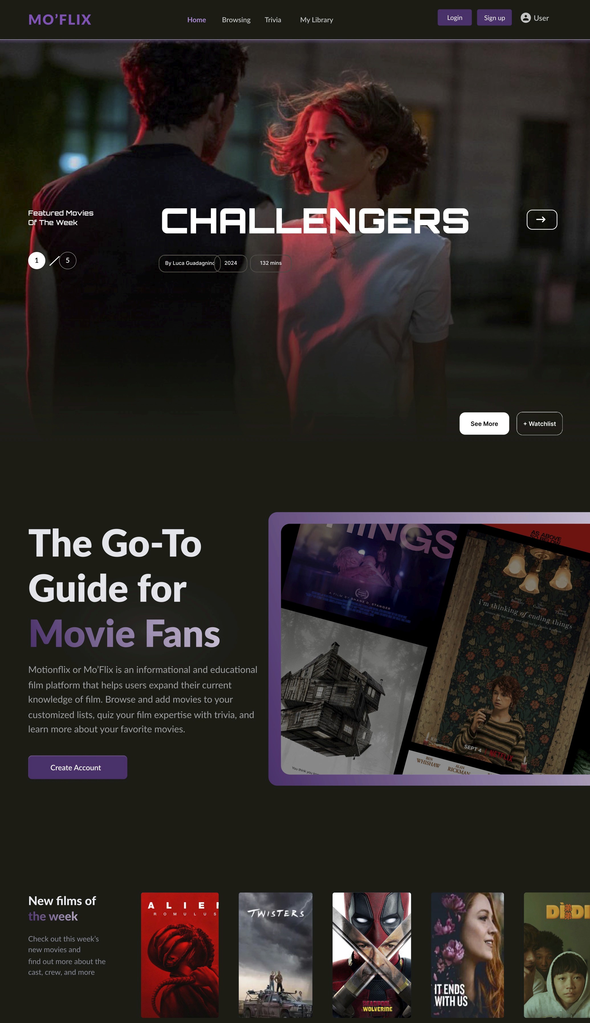 The platform features a simple, intuitive design that minimizes the learning curve, making it accessible to a wide audience. Our application encourages users to stay engaged through interactive elements such as the trivia section as a form of applying their newfound film knowledge or creating personalized lists to keep track of the films they’ve watched.
