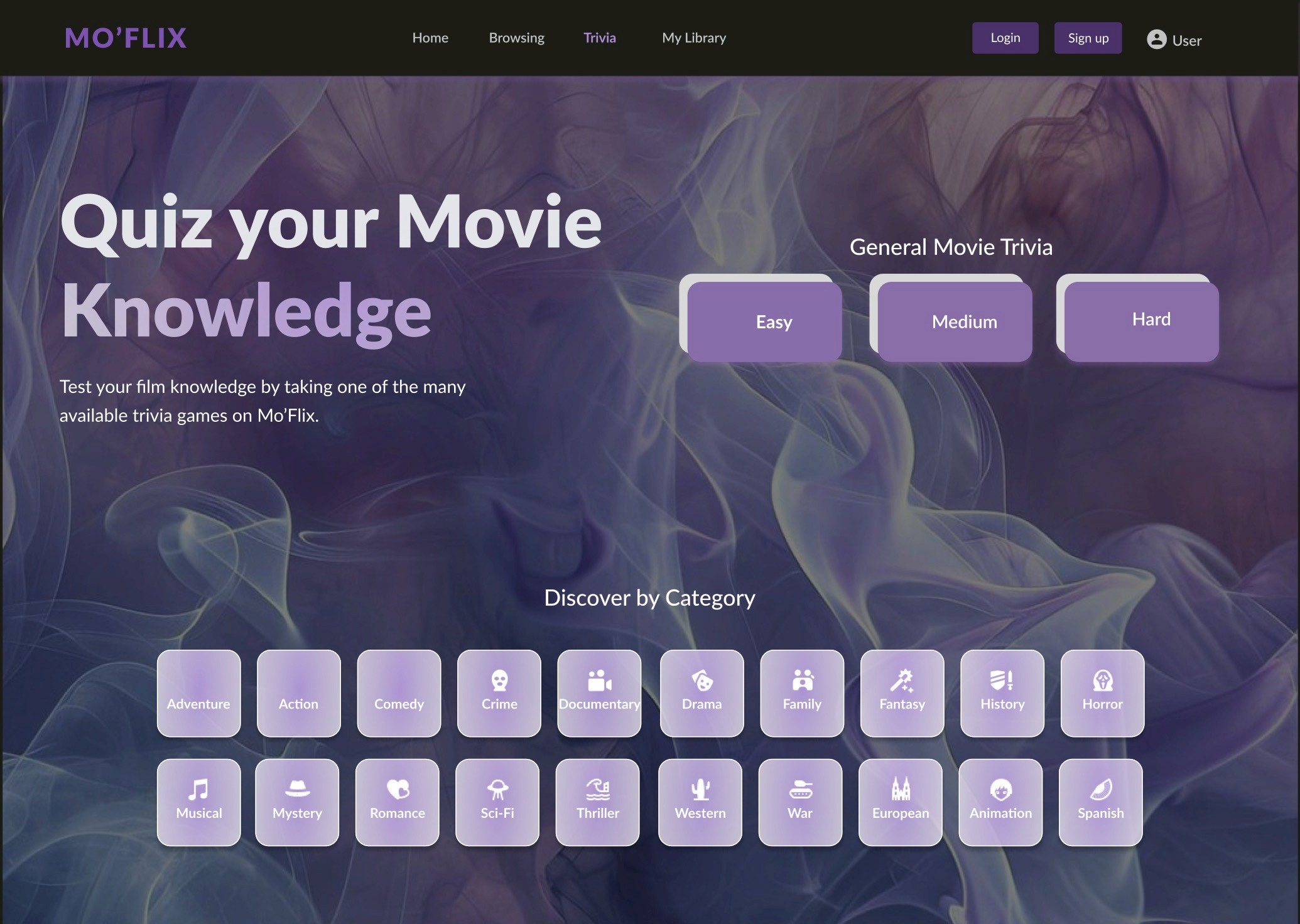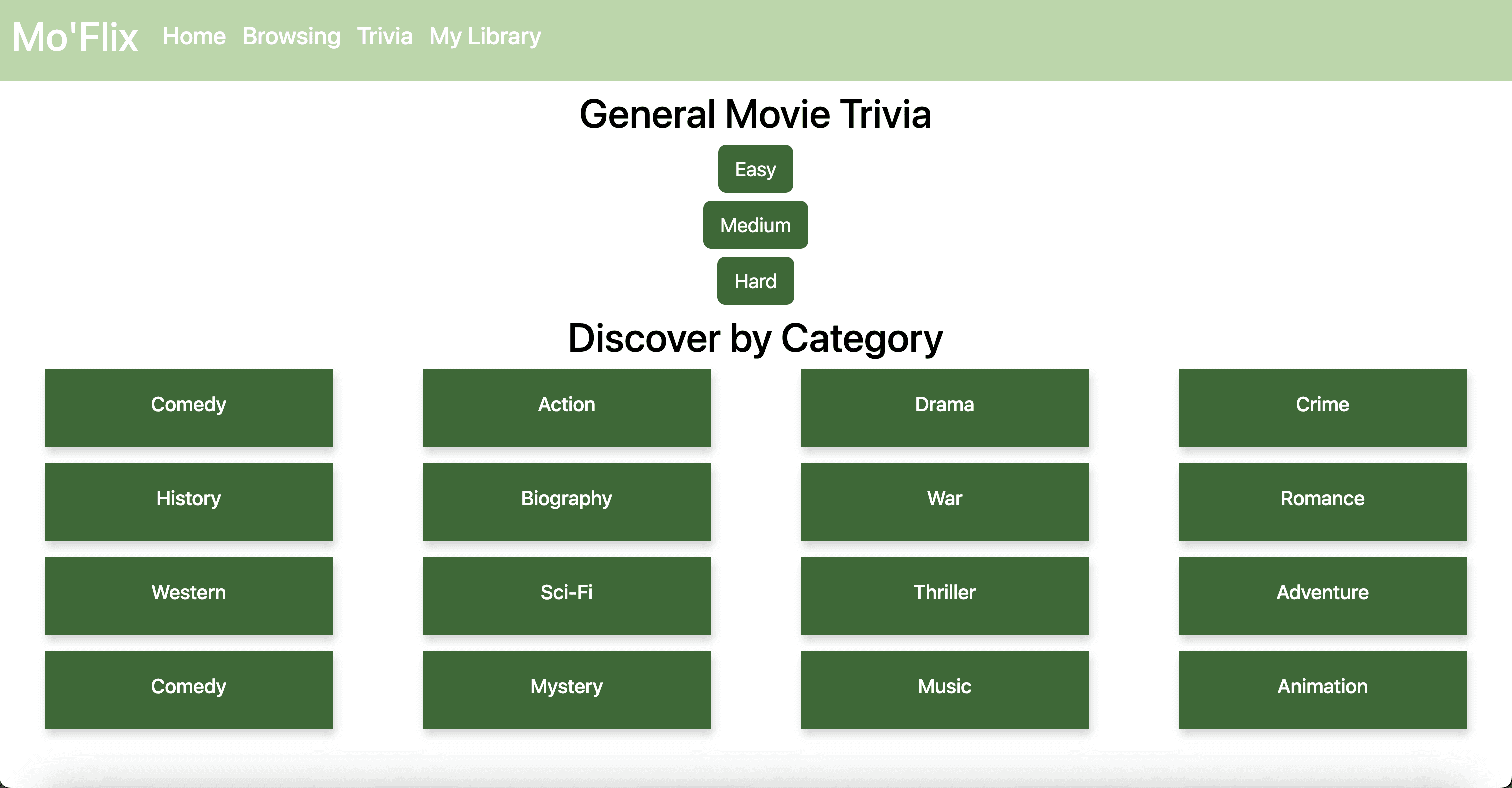 Upon first going to the trivia page, the user is greeted with a list of options they can choose from. They can opt for an easy, medium, or hard level of general movie trivia, or they can click on a specific genre. If they do the latter, they will be able to choose an easy, medium, or hard level of trivia corresponding with that specific chosen genre.