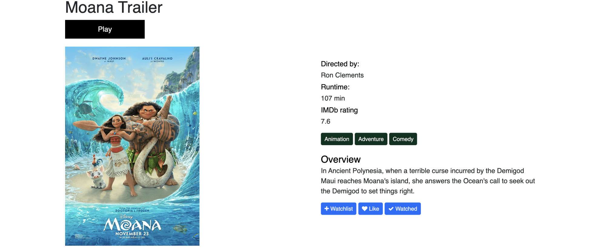 Next, users can click the right arrow button to symbolize viewing the rest of their category. Lastly, they can click on a film they seek to learn more about. For example, in the third step displayed above, the user is brought to the movie profile for Moana, directed by Ron Clements.