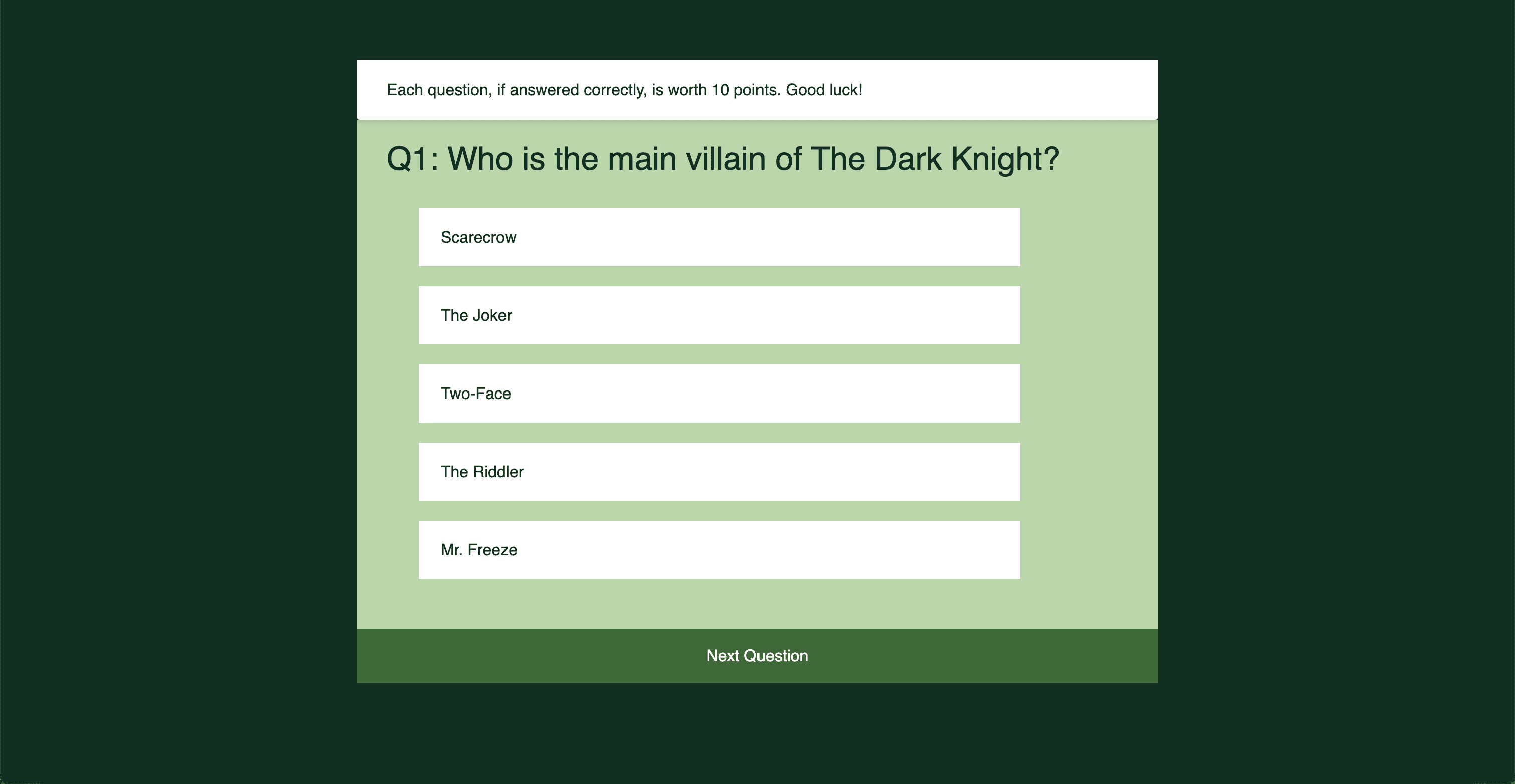 As of now, the trivia has four questions, each of which is displayed in a sequence.The user chooses an answer to the question, clicks the “Next Question” button (which changes color when the user hovers over it as well), and then gets another question to answer. They keep doing this until the quiz is over, at which point a congratulatory screen with the user’s final point value is displayed.